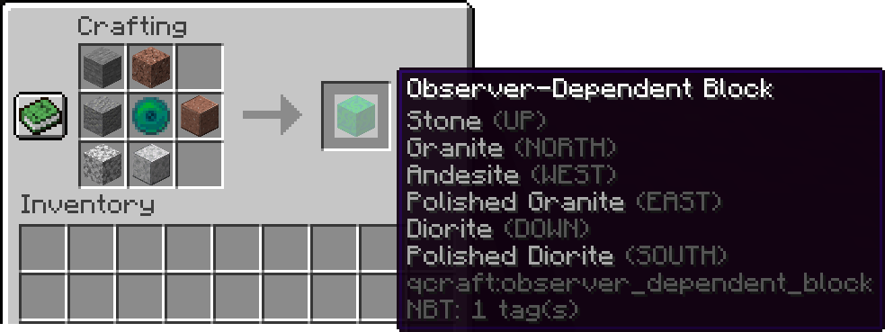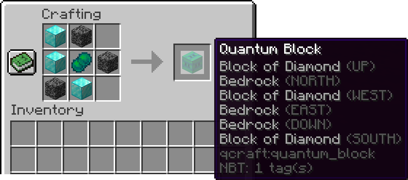 Both types of qBlocks are crafted in the same way but with different essences. Place the required essence in the center of the crafting inventory. The essence then needs to be surrounded by block items. The block's position in the recipe dictates the face for observation, like so: