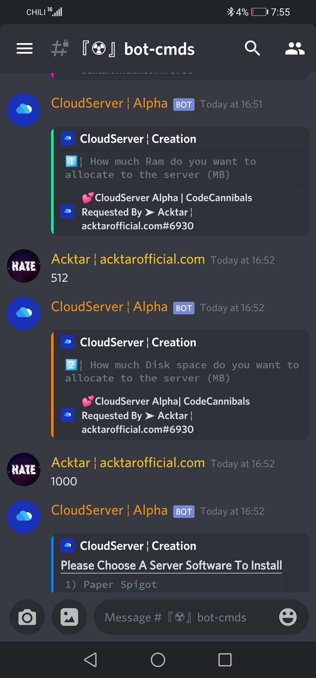 CloudServer is an advanced discord bot made specially for the owners of small host which eases the task of server creation and management: