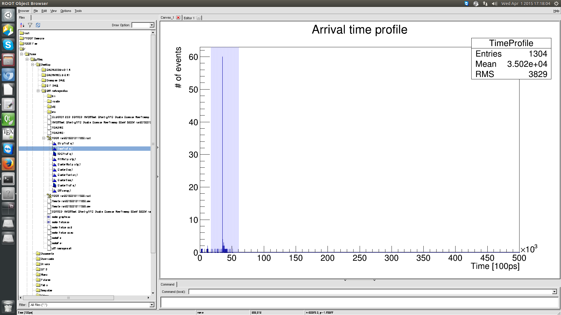 and look into the histogram called "TimeProfile". Zoom on the cosmics pic to get the first and last bin values. To do so, the first step is to place the mouse onto the axis at the level of the units :