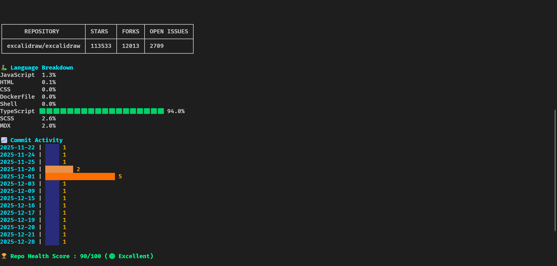 Repo-lyzer is a modern, terminal-based CLI tool written in Golang that analyzes GitHub repositories and presents insights in a beautifully formatted, interactive dashboard.