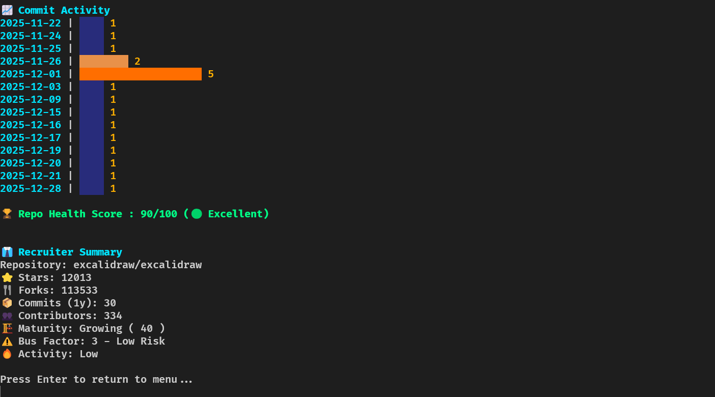 It is designed for developers, recruiters, and open-source enthusiasts to quickly evaluate a repository’s health, activity, and contributor statistics.