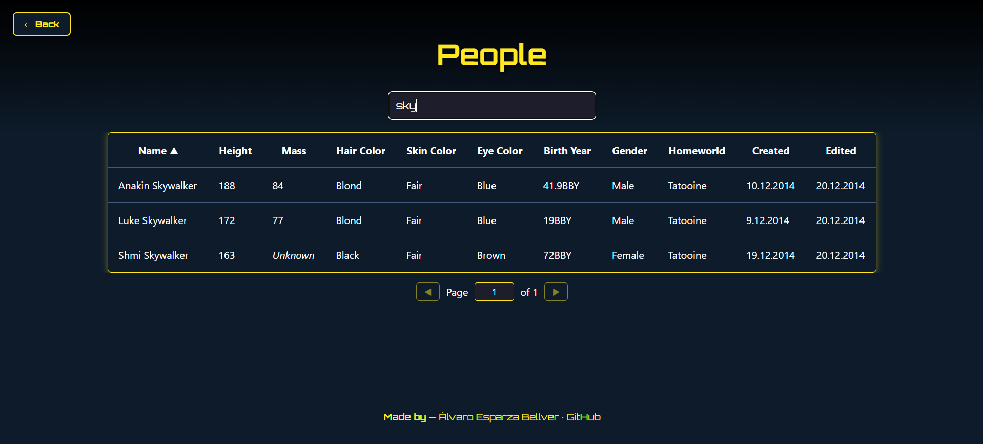 An interactive Star Wars data browser built with Angular and Spring Boot, styled with a custom dark theme inspired by the galaxy itself. Explore characters and planets from the Star Wars universe through a responsive, paginated, and filterable UI — all deployed with Docker.