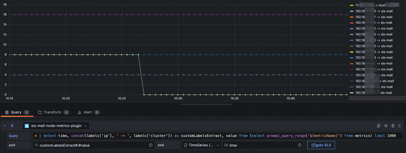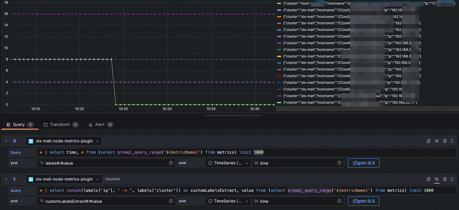 query: * | select concat(labels['ip'], ' -> ', labels['cluster']) as customLabelsExtract, value from (select promql_query_range('${metricName}') from metrics) limit 1000