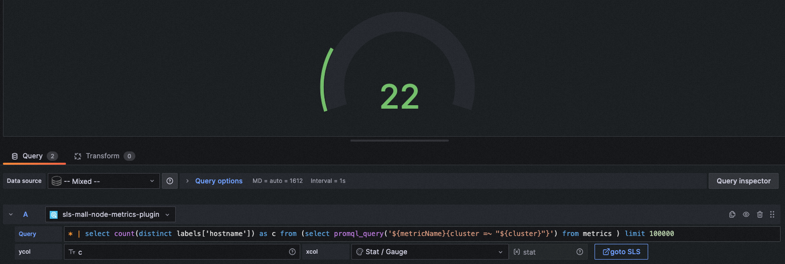 query: * | select count(distinct labels['hostname']) as c from (select promql_query('${metricName}{cluster =~ "${cluster}"}') from metrics ) limit 100000