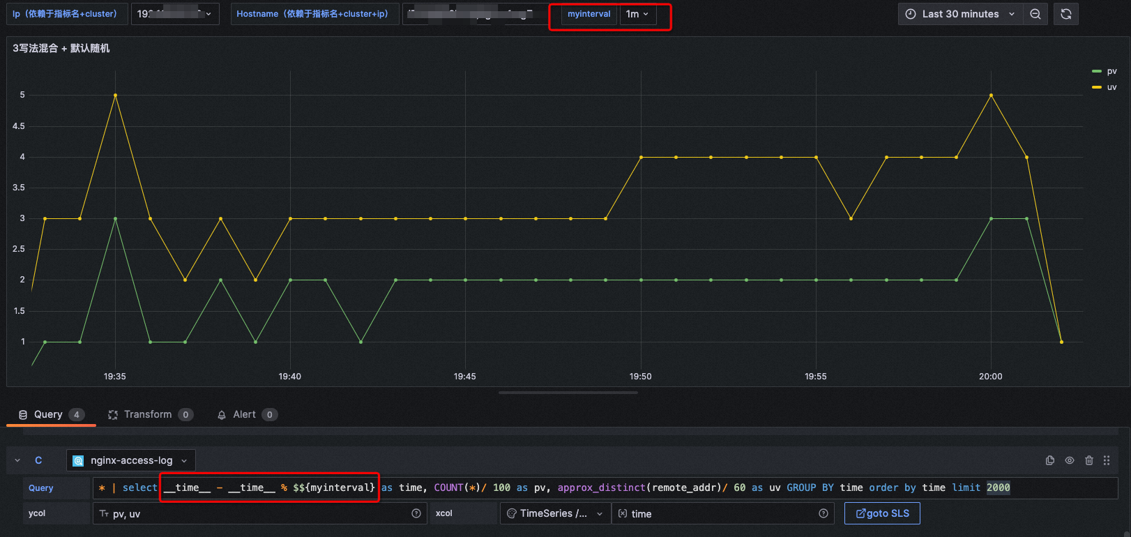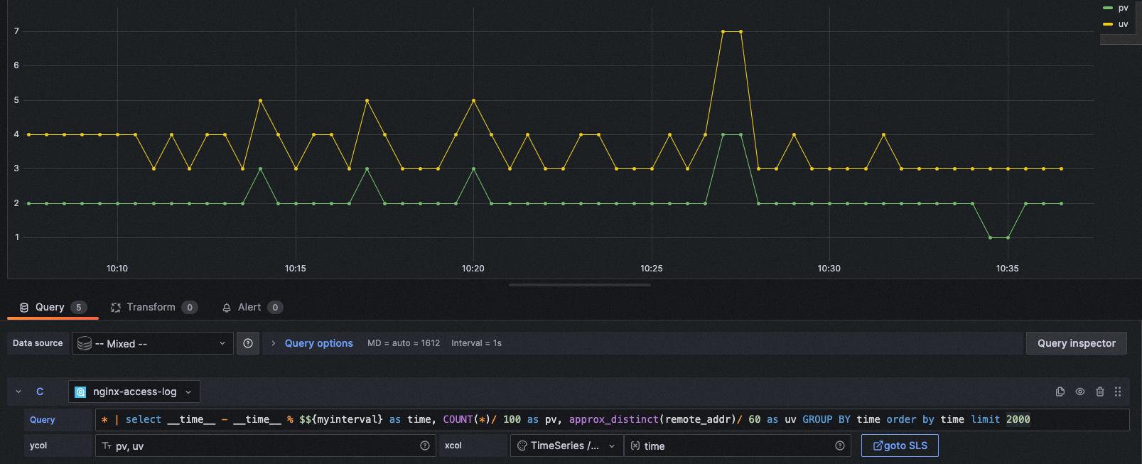 query: * | select __time__ - __time__ % $${myinterval} as time, COUNT(*)/ 100 as pv, approx_distinct(remote_addr)/ 60 as uv GROUP BY time order by time limit 2000