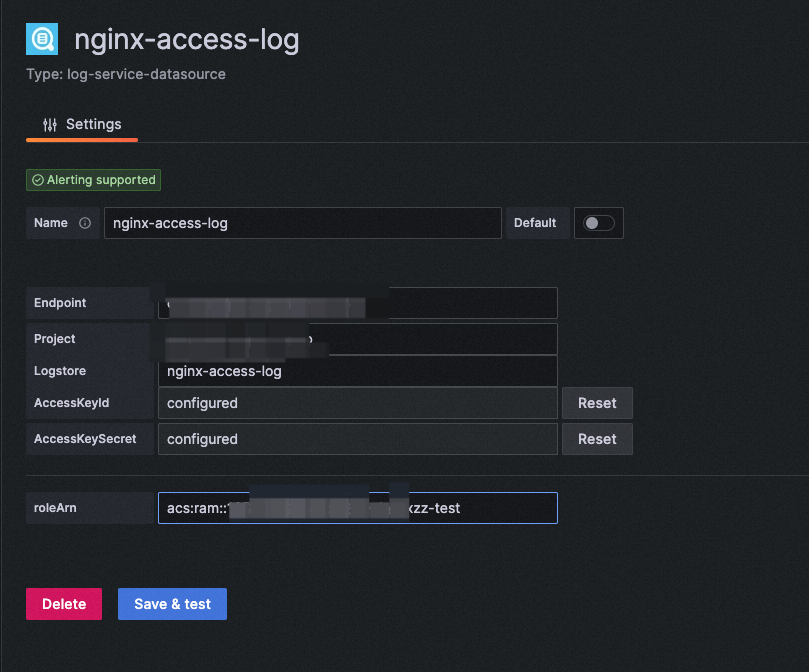 SLS的时序库支持原生Prometheus查询,因此可以直接使用原生Prometheus插件进行数据源接入。请参考如下官方文档配置数据源。日志服务MetricStore的URL,格式为https://{project}.{sls-endpoint}/prometheus/{project}/{metricstore}。其中_{sls-endpoint}为Project所在地域的Endpoint,详情请参见服务入口,{project}和{metricstore}_为您已创建的日志服务的Project和Metricstore,请根据实际值替换。例如:https://sls-prometheus-test.cn-hangzhou.log.aliyuncs.com/prometheus/sls-prometheus-test/prometheus