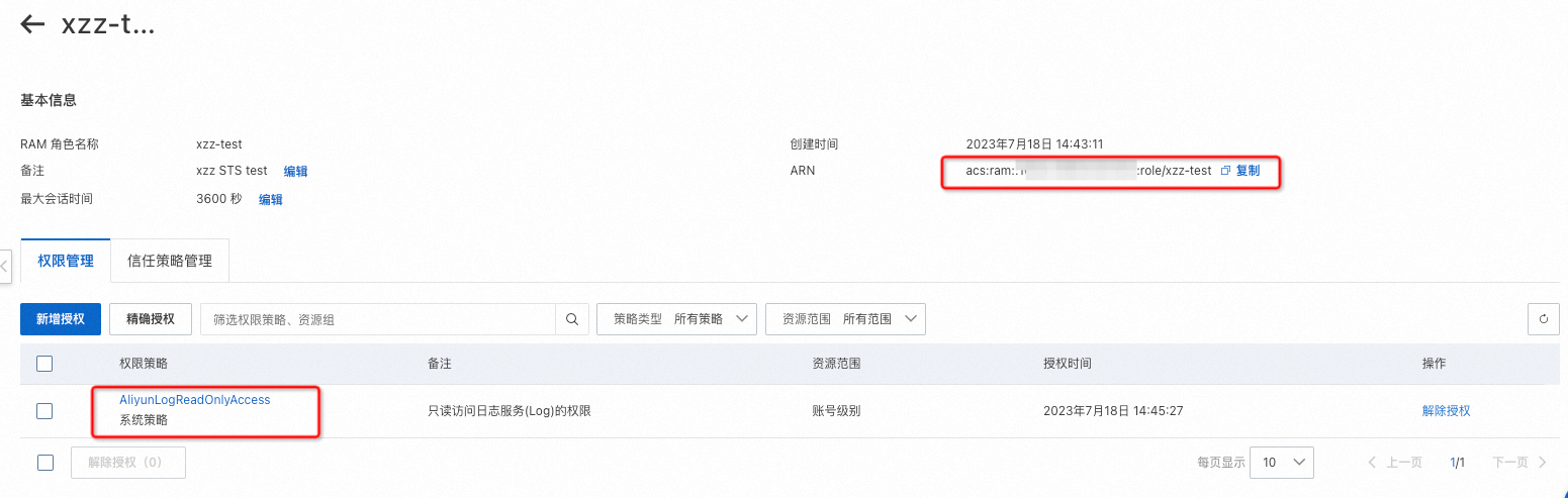 - 访问RAM控制台https://ram.console.aliyun.com/roles/,创建一个**有且只有AliyunLogReadOnlyAccess**权限策略的角色。建议最大会话时间为3600秒。在基本信息处可复制roleArn信息。
