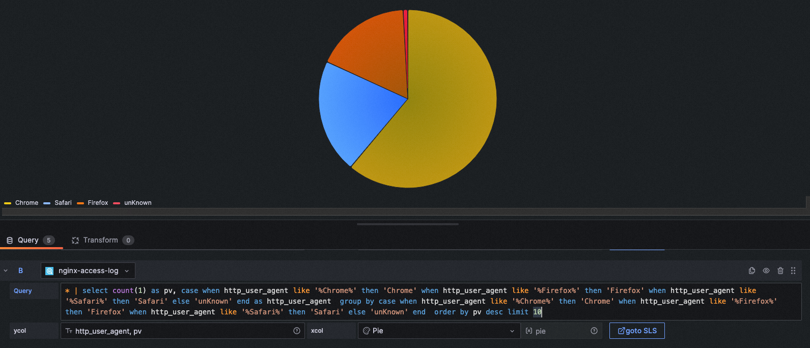 query: * | select count(1) as pv, case when http_user_agent like '%Chrome%' then 'Chrome' when http_user_agent like '%Firefox%' then 'Firefox' when http_user_agent like '%Safari%' then 'Safari' else 'unKnown' end as http_user_agent group by case when http_user_agent like '%Chrome%' then 'Chrome' when http_user_agent like '%Firefox%' then 'Firefox' when http_user_agent like '%Safari%' then 'Safari' else 'unKnown' end order by pv desc limit 10