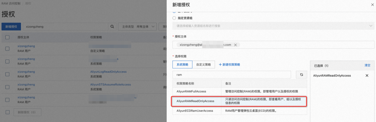 - 访问RAM控制台授权界面https://ram.console.aliyun.com/permissions,给在Grafana DataSource配置的AccessKey对应的用户,赋予AliyunRAMReadOnlyAccess、AliyunSTSAssumeRoleAccess权限。(或更换Grafana DataSource配置的AccessKey、AccessSecret,必须保证用户有该权限)