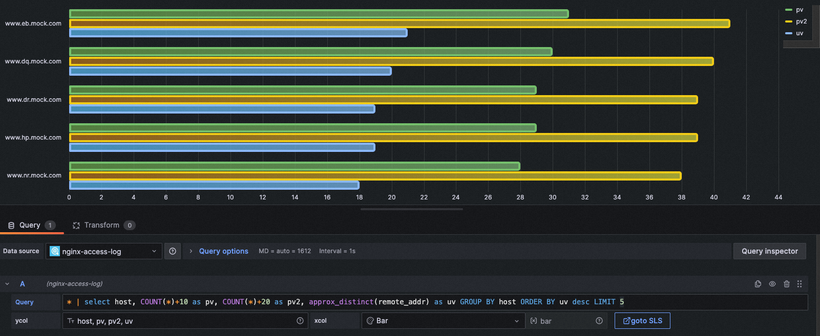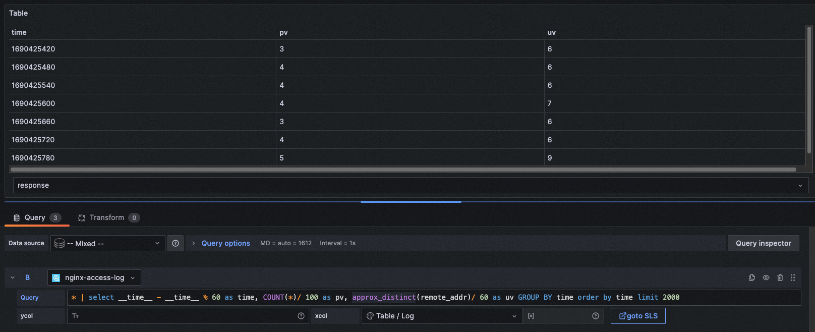 query: * | select __time__ - __time__ % 60 as time, COUNT(*)/ 100 as pv, approx_distinct(remote_addr)/ 60 as uv GROUP BY time order by time limit 2000