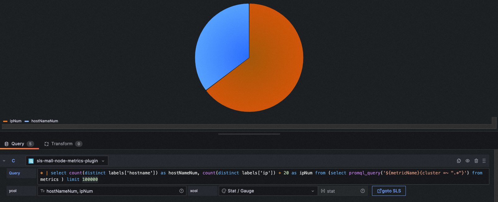 query: * | select count(distinct labels['hostname']) as hostNameNum, count(distinct labels['ip']) + 20 as ipNum from (select promql_query('${metricName}{cluster =~ ".*"}') from metrics ) limit 100000