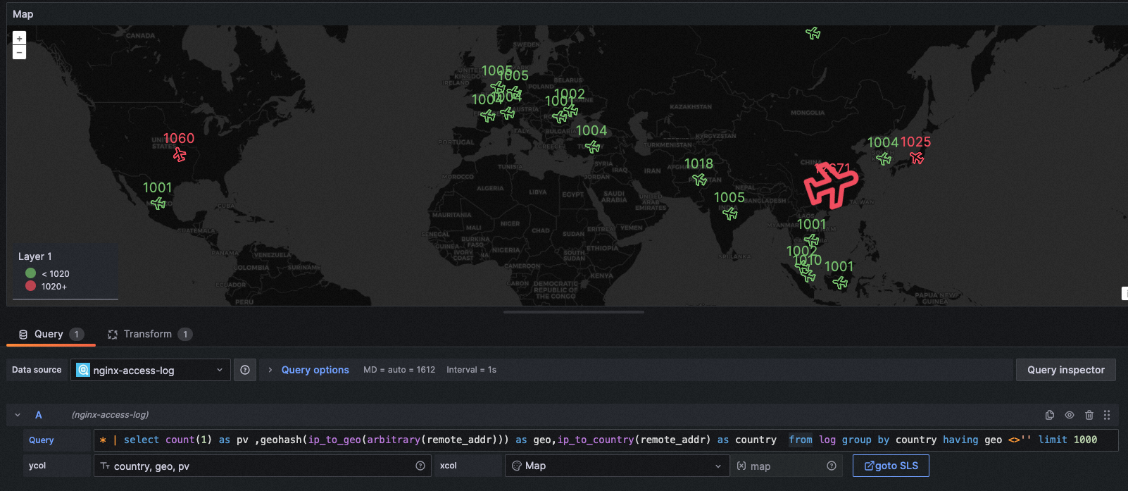 query: * | select count(1) as pv ,geohash(ip_to_geo(arbitrary(remote_addr))) as geo,ip_to_country(remote_addr) as country from log group by country having geo <>'' limit 1000