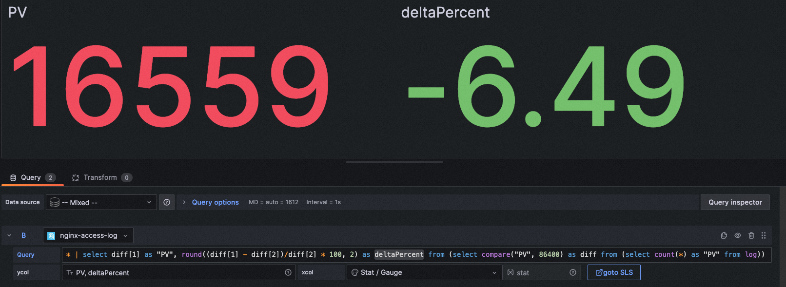 query: * | select diff[1] as "PV", round((diff[1] - diff[2])/diff[2] * 100, 2) as deltaPercent from (select compare("PV", 86400) as diff from (select count(*) as "PV" from log))