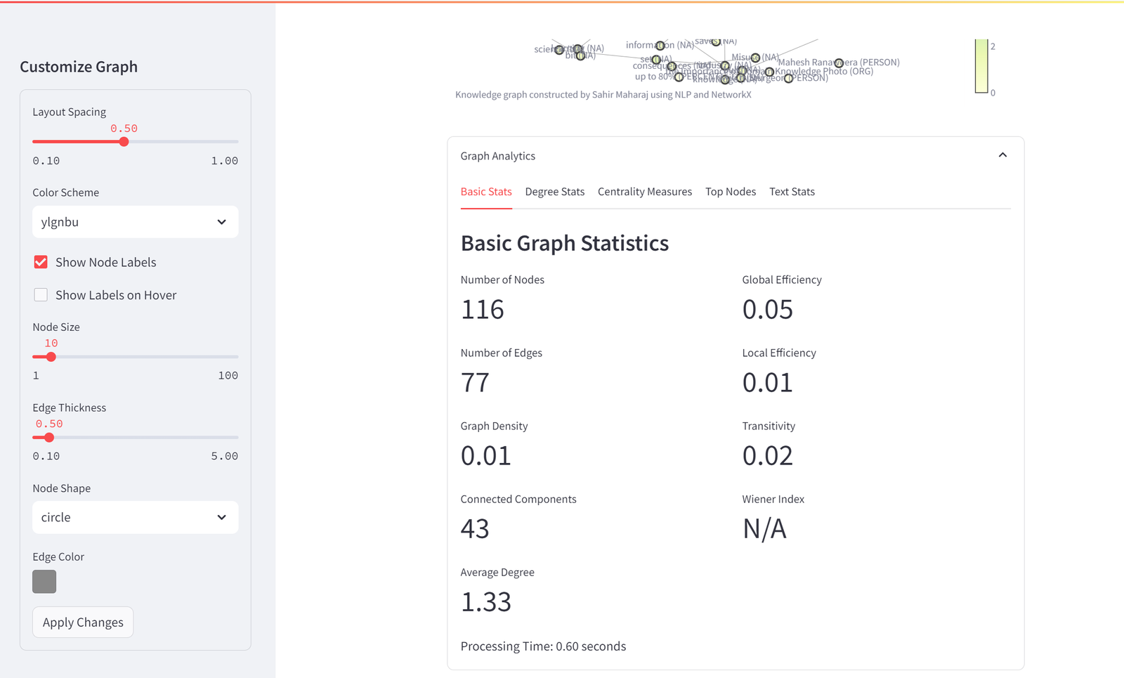 5. Explore Graph Analytics: View various statistics and metrics related to the generated graph and the input text.