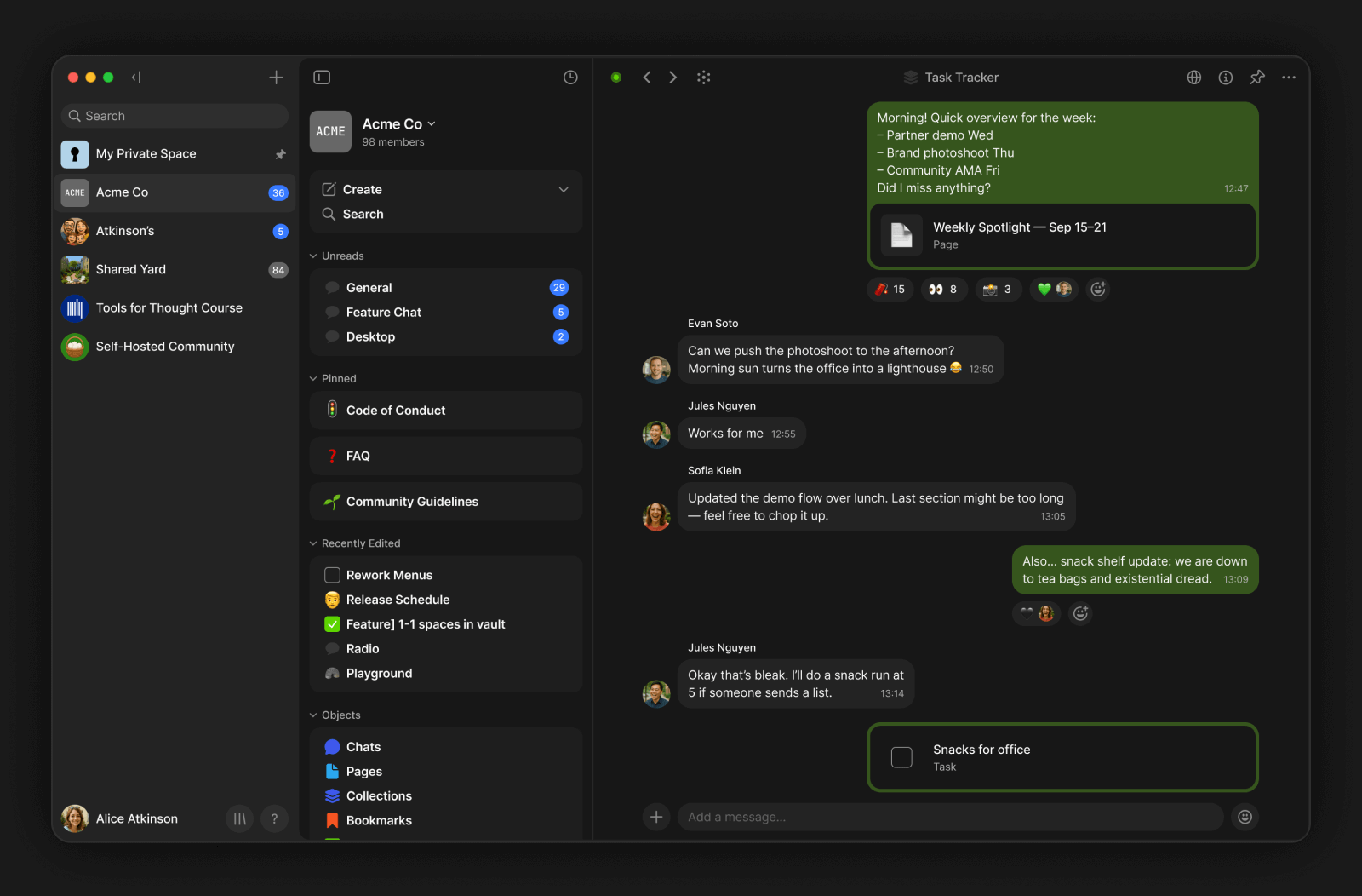 - Create Objects right from your chat window – turn thoughts into Pages, Tasks, or any other Type.