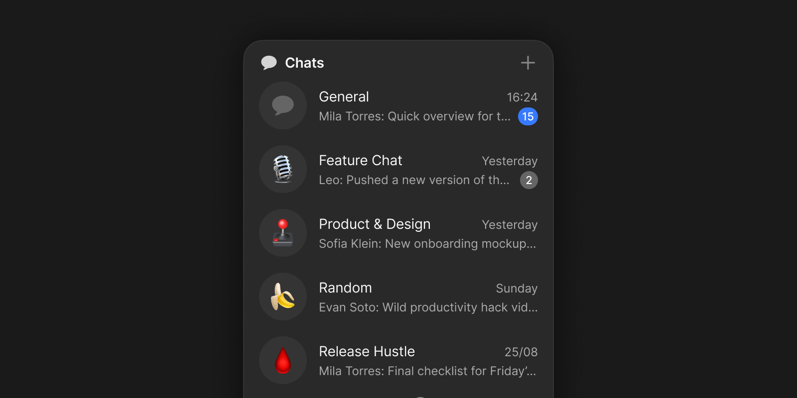 The Chats Type Widget works like any other widget: you can pin it to your Sidebar, adjust its appearance by choosing how many chats to show, and pin individual chats for quicker access.Unlike other Widgets, pinned chats display counters and mention indicators directly in the Sidebar. A temporary Unread section also appears automatically when new messages arrive, listing chats with unread content.