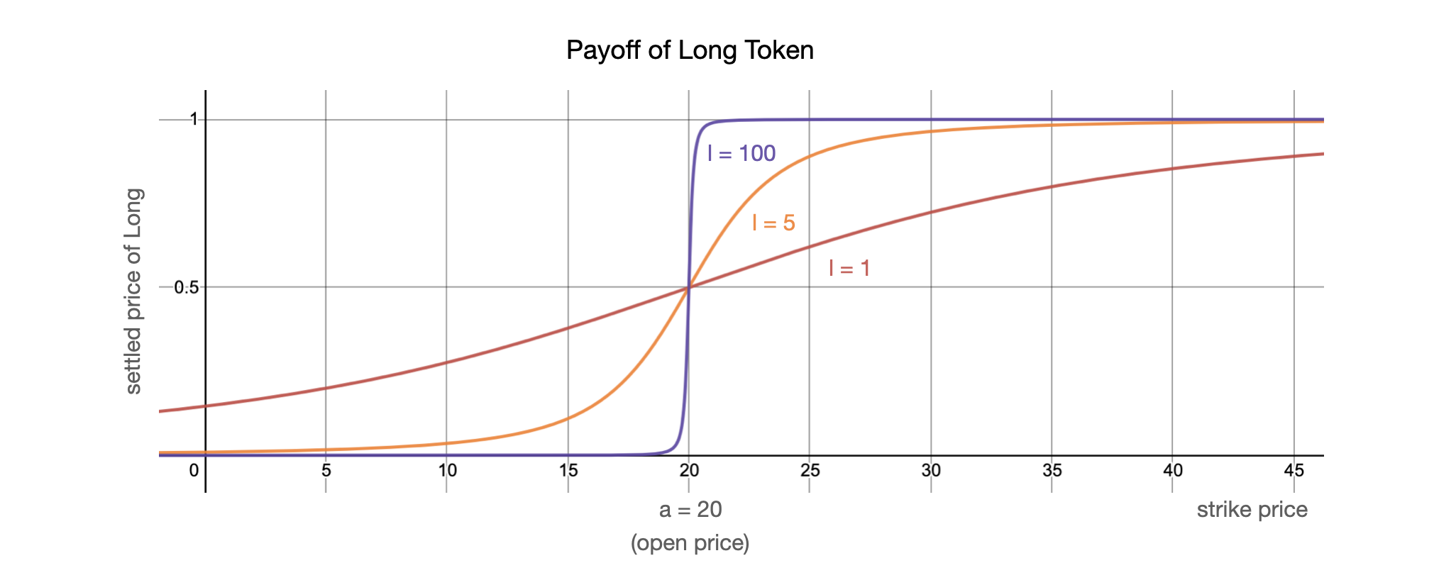 As the leverage (l) is larger, the horizontal compression occurs and the function's base graph is shrunk along the x-axis. Therefore, the liquidity values move in closer and closer to the centre, which is known as the starting price. In addition, to the same settlement price, the difference between the centre and the strike price will be inversely proportional to the leverage (l).