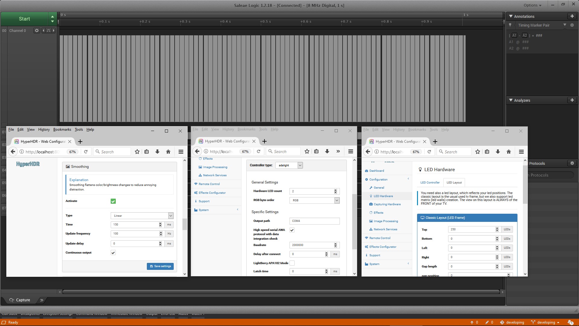 Arduino: 250 RGB leds, 500000 baud, 100 Hz output from HyperHDR, real output for the LED strip is around 20Hz.