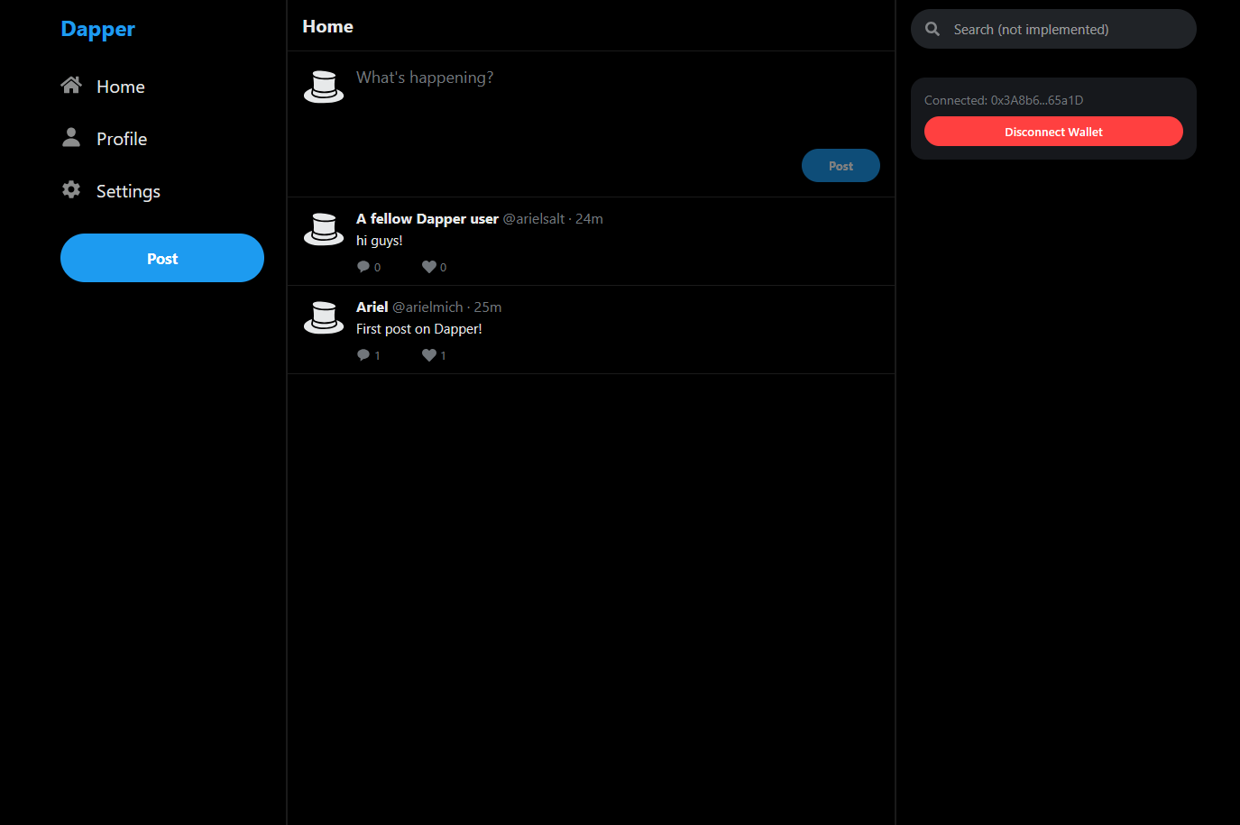 Dapper is a decentralized social media network built on Solidity smart contracts and IPFS storage technology. It was made for a class assignment. It is built to be run on the BNB Smart Chain Testnet.