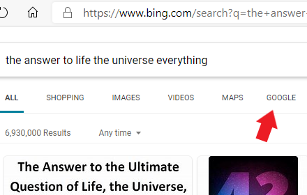 Do you want to keep Bing as your default search engine but sometimes you need Google? This extension adds a Google button to Bing. Minimal footprint with just ~50 lines of code.