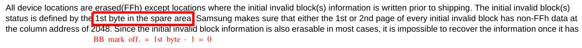 - BB mark off. - the offset of byte in the spare area which contains bad block mark. The block is considered as bad if the byte contains non 0xFF value. The offset starts from 0.