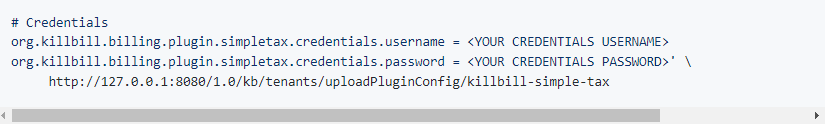 On my version of simpletax, one of the updates is adding another config on the one already provided by @bgandon These config are needed since in v0.22.28, we need authentication to do custom tag operations. You can test-run it with admin user provided default by Killbill |