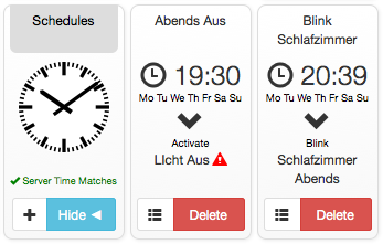 - Schedule system allows automatic triggering of scenes at specified times, supports special actions like turning a scene off, having it slowly fade in or making the lights blink, can be scheduled only on certain weekdays, checks for differences between client & server time to avoid surprises, schedules can be deactivated as well