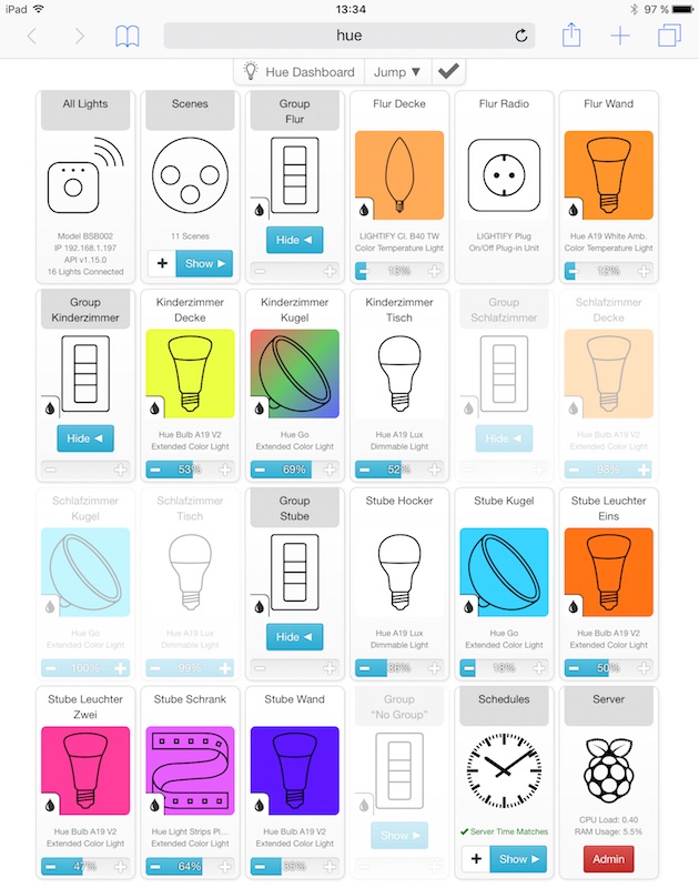 - Adjusting individual lights or the automatically created groups is comfortable both with a mouse and touch based input