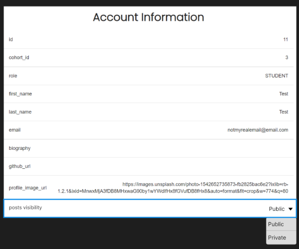 For the toggle in the Account Component I will create a function that sends a PATCH request to ‘/user/myprofile’ containing the true or false value for privacy preferences (https://masteringjs.io/tutorials/axios/axios-patch).
