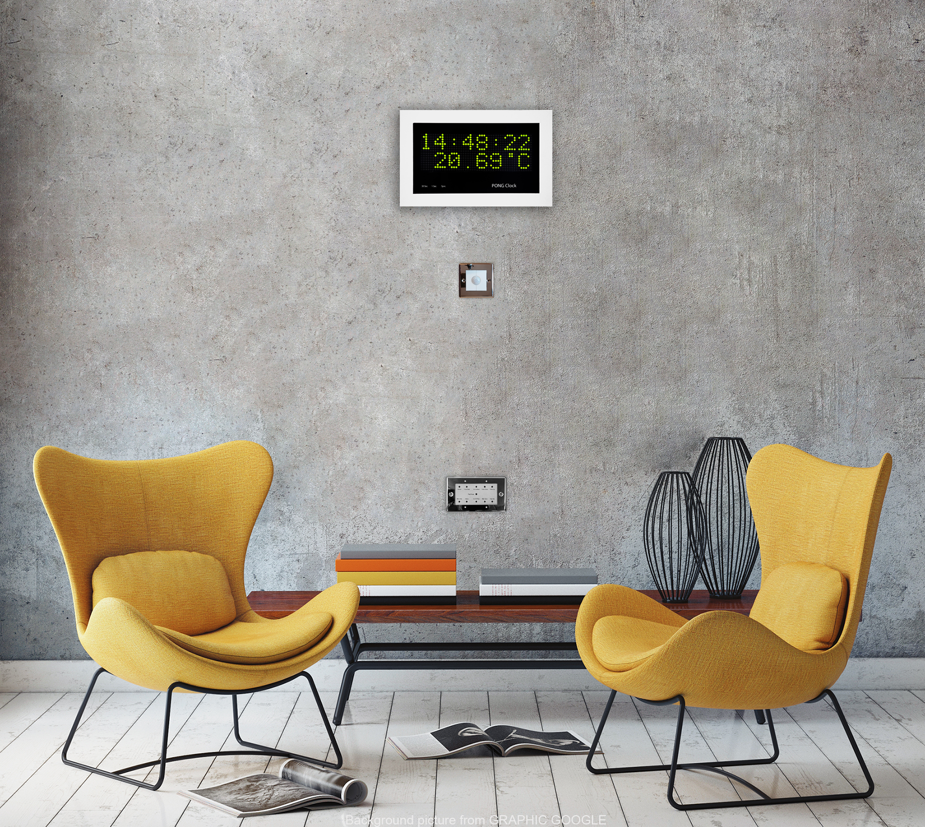 Image below shows PIR and control panel. These can be mounted inside the clock case if required.