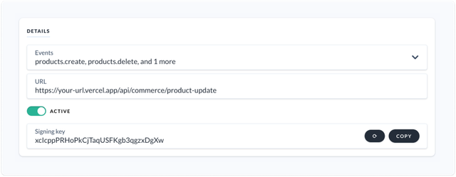 https://[subdomain].vercel.app/api/commerce/product-update - Make note of the signing key as you will need this into the environment variables in the below Next.js set up steps