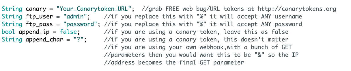 Next, got to Canarytokens.org and create a "Web bug" token. Copy the URL and paste it in the part of the code below, while setting the username and password for the honeypot FTP server: