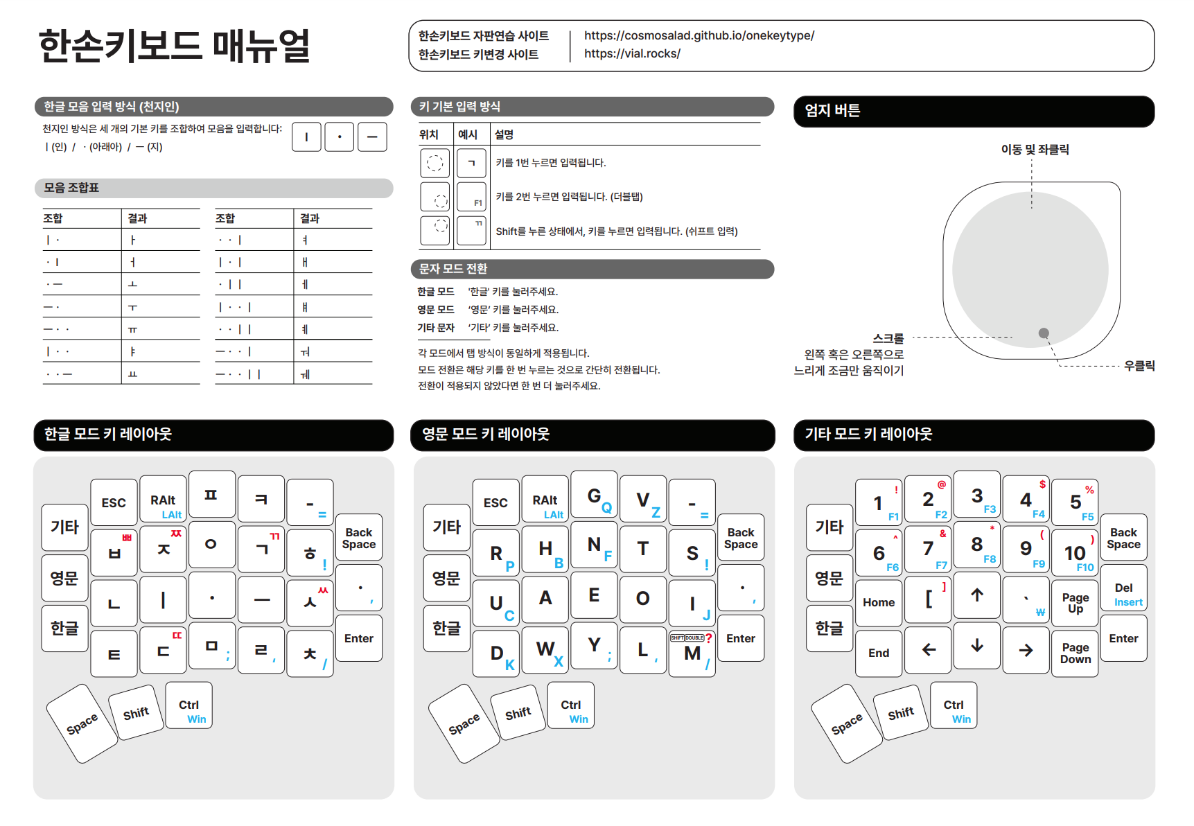 [보건복지부 국립재활원] 한손키보드 (보조기기 신청) Onekey(한손키보드) 천지인 형식 기반 한손 키보드 ▶ 전용 자판 연습 사이트 ▶ 키 매핑 사이트 ▶ 오픈소스 Onekey prototype v1.0