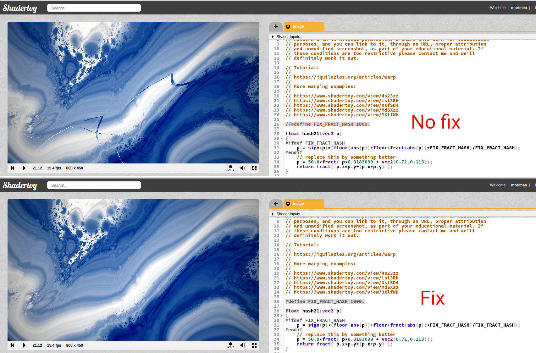 BUG TEST Rough Seas fract hash - Just test shader for this blog post Hash Noise stability in GPU Shaders, blog mirror. |