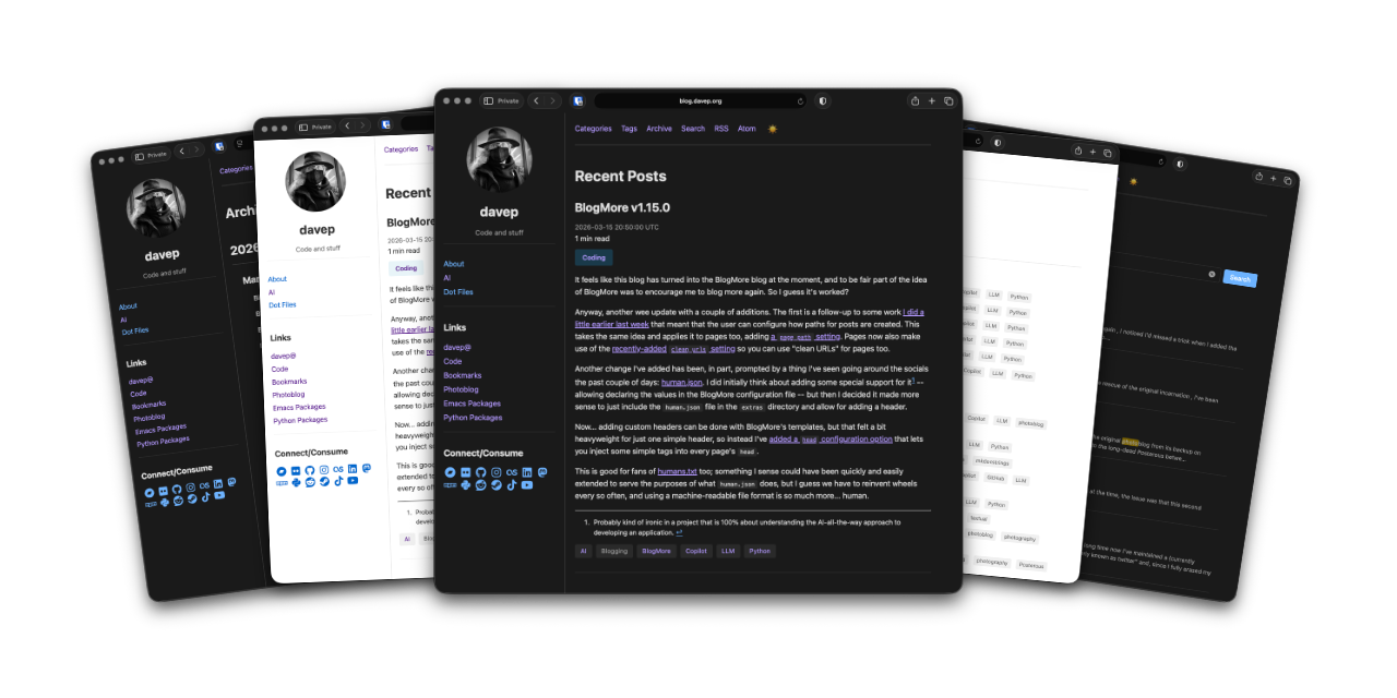 sitemap.xmlfor search engine indexing - Blog statistics page — optional stats page with histograms, word counts, reading times, lifespan, top linked domains, and more