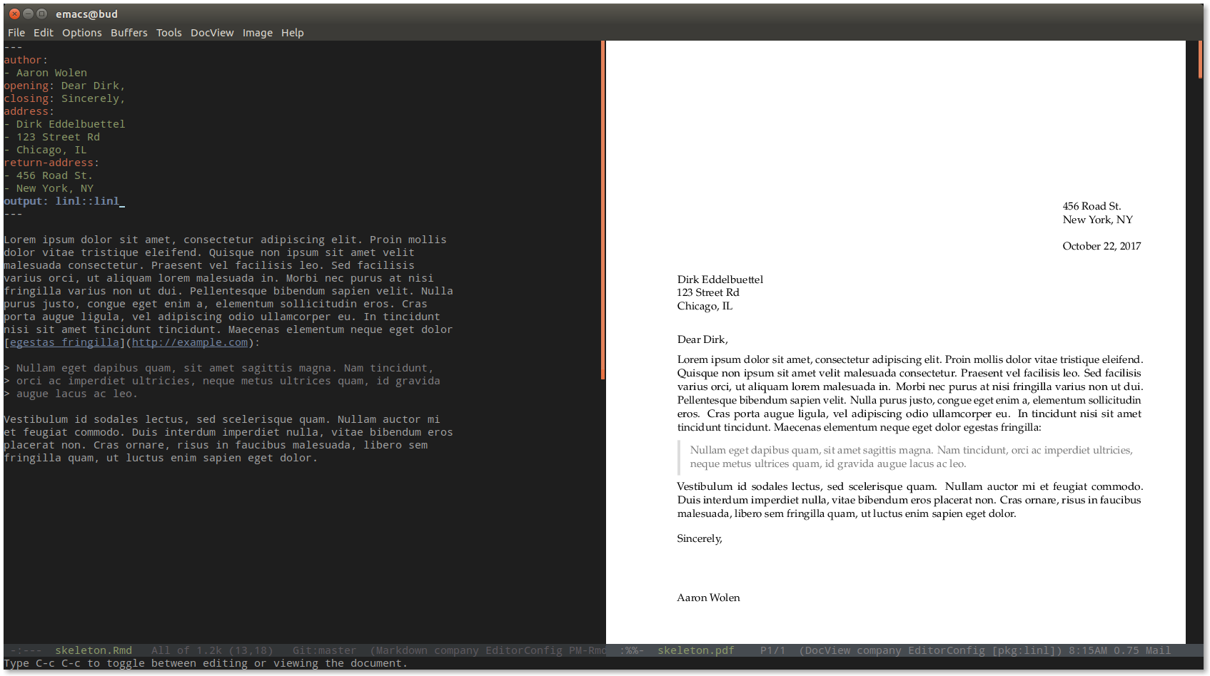 The vignette example is a little more featureful and shows how to include a letterhead on-demand, a signature, and a few formatting settings. All of these are driven by simple YAML headers as seen on the left: