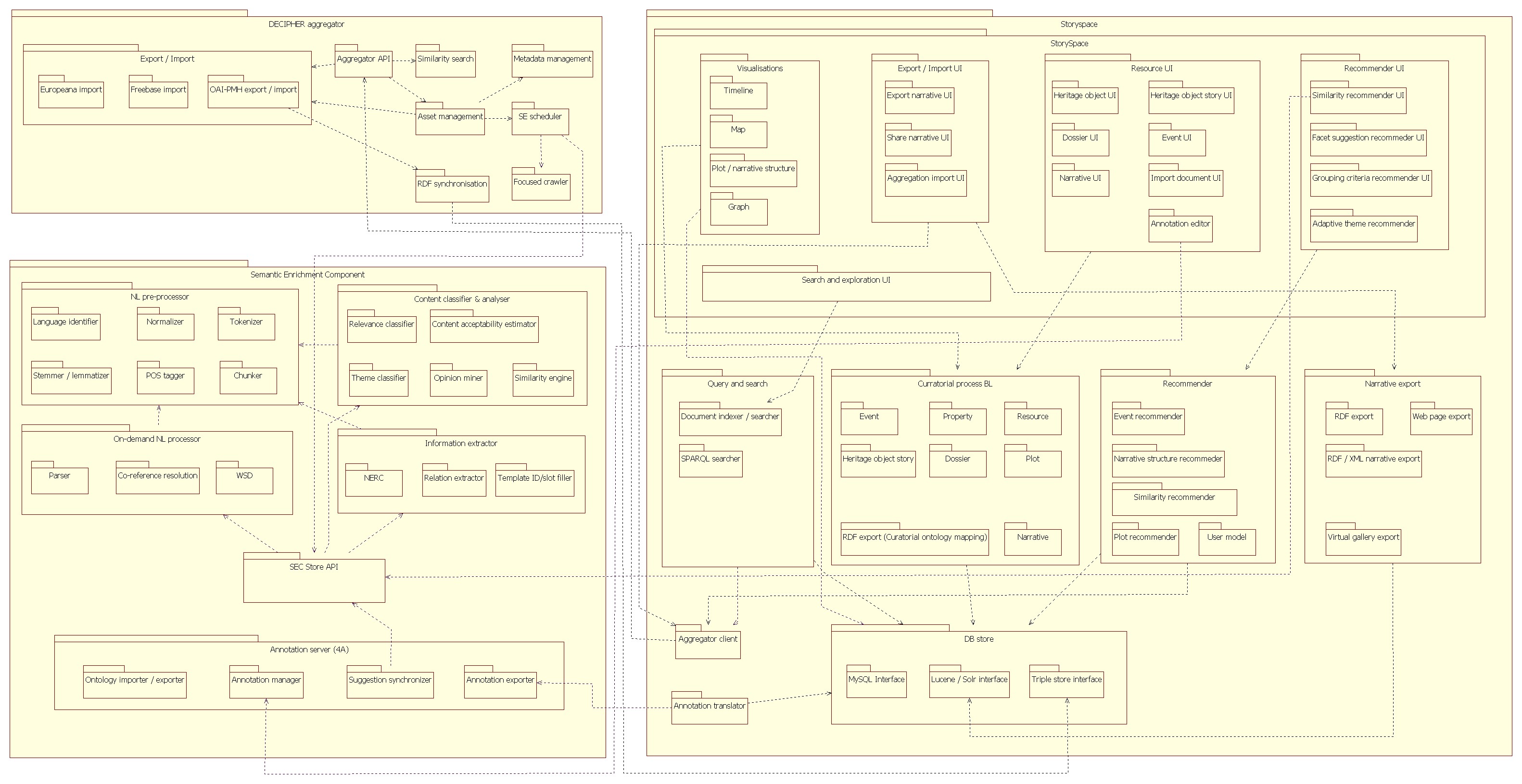 The triplestore is used to represent the content of Storyscope instances plus additional related Linked Data. A custom Drupal module is used to asynchronously update the triplestore based on any changes to the Drupal instance. The synchronisation module uses the Sesame API to read and modify data in a Sesame triplestore. The data can be stored in either an Owlim or RDF/S repository depending on the reasoning to be performed on the data. There is a publicly accessible Sesame triplestore for DECIPHER at the Open University running on a Tomcat server. The Storyscope recommender components, written in Java, also run on a Tomcat server. The recommender components receive requests from a Storyscope installation, query the triplestore and other Linked Data sources as required, and then return results to the Storyscope installation in XML. These are then rendered in the Storyscope user interface. The Open University triplestore uses BigOwlim repositories that can perform SPARQL 1.1 reasoning. For compatibility with OWLIM and RDF/S repositories, the recommender components use SPARQL 1.0 queries to the triplestore.