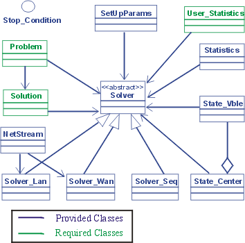 More specifically, each skeleton includes the Problem and Solution required classes, that encapsulate the problem-dependent entities needed by the resolution method. The Problem class abstracts the features of the problem that are relevant to the selected optimization method. The Solution class abstracts the features of the feasible solutions that are relevant to the selected resolution method. Depending on the skeleton, other classes may be required. On the other hand, each skeleton offers two provided classes: Solver and SetUpParams. The former abstracts the selected resolution method. The later contains the setup parameters needed to perform the execution (e.g. number of iterations, number of independent runs, parameters guiding the search, etc.). The Solver class provides methods to run the resolution scheme and methods to consult its progress or change its state. The only information the solver needs is an instance of the problem to solve and the setup parameters. In order to enable an skeleton to have different solver engines, the Solver class defines a unique interface and provides several subclasses that provide different sequential and parallel implementations (Solver_Seq, Solver_Lan and Solver_Wan). In Fig. 1 is shown the common design of Mallba skeletons.