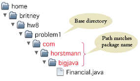 A source file must be located in a subdirectory that matches the package name. The parts of the name between periods represent successively nested directories. For example, the source files for classes in the package com.horstmann.bigjava would be placed in a subdirectory com/horstmann/bigjava. You place the subdirectory inside the base directory holding your program’s files. For example, if you do your homework assignment in a directory /home/britney/hw8/problem1, then you can place the class files for the com.horstmann.bigjava package into the directory /home/fabian/hw8/problem1/com/horstmann/bigjava, as shown in Figure 9.19.1. (Here, we are using UNIX-style file names. Under Windows, you might use c:\Users\Fabian\hw8\problem1\com\horstmann\bigjava.)