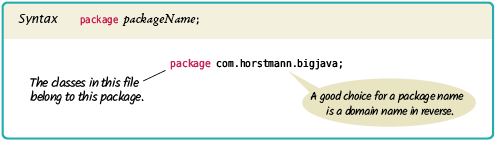 package packageName;as the first instruction in the source file containing the class. A package name consists of one or more identifiers separated by periods. (See Section 9.19 for tips on constructing package names.)