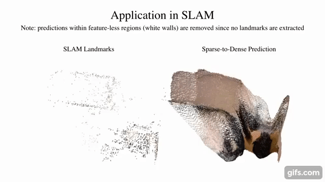 RGB rms rel delta1 delta2 delta3 Make3D 8.734 0.280 60.1 82.0 92.6 Mancini et al (IROS 2016) 7.508 - 31.8 61.7 81.3 Eigen et al (NIPS 2014) 7.156 0.190 69.2 89.9 96.7 Ours-RGB 6.266 0.208 59.1 90.0 96.2 RGBd-#samples rms rel delta1 delta2 delta3 Cadena et al (RSS 2016)-650 7.14 0.179 70.9 88.8 95.6 Ours-50 4.884 0.109 87.1 95.2 97.9 Liao et al (ICRA 2017)-225 4.50 0.113 87.4 96.0 98.4 Ours-100 4.303 0.095 90.0 96.3 98.3 Ours-200 3.851 0.083 91.9 97.0 98.6 Ours-500 3.378 0.073 93.5 97.6 98.9 Note: our networks are trained on the KITTI odometry dataset, using only sparse labels from laser measurements.