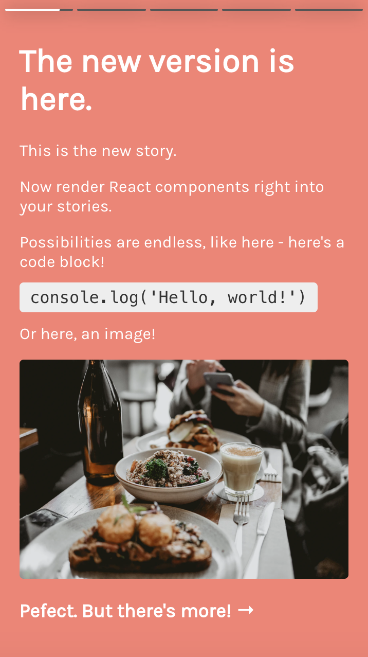 npm install --save react-insta-storiesThe component responds to actions like tap on right side for next story, on left for previous and tap and hold for pause. Custom time duration for each story can be provided. See it in action here: https://mohitk05.github.io/react-insta-stories/