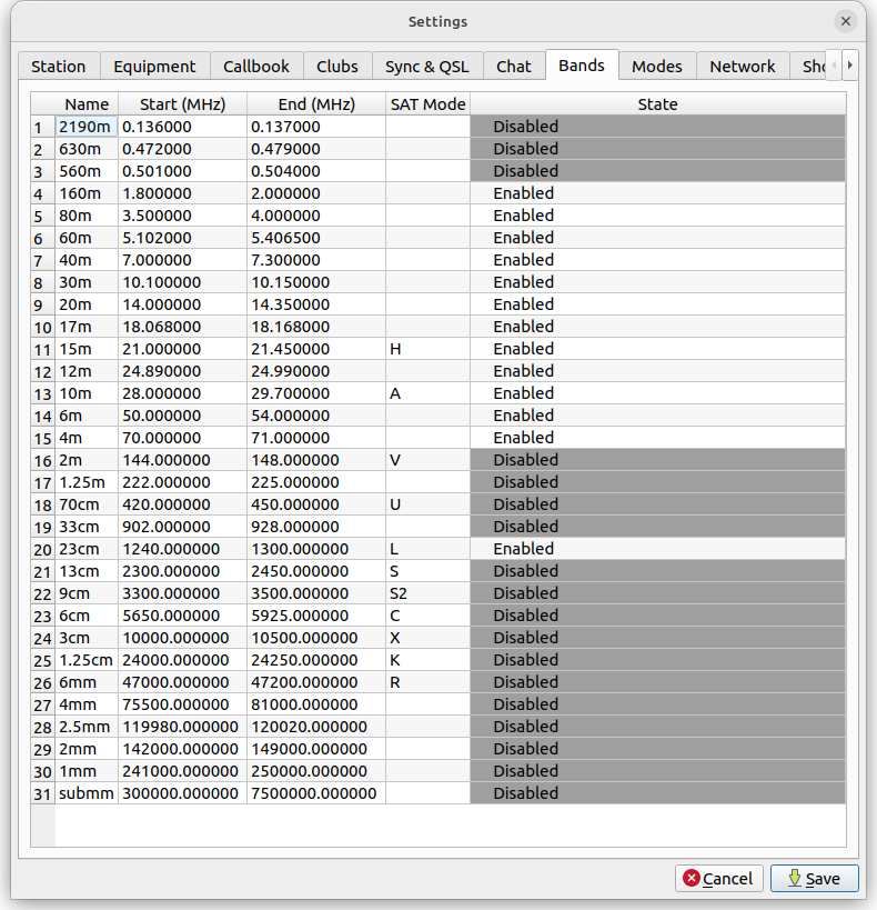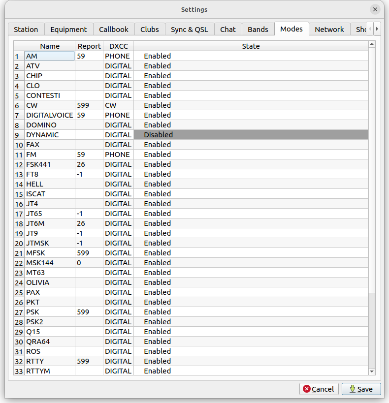 Tab show all supported modes. The same way as in case of Band, the Modes can be enabled/disabled by double-clicking of the State value.