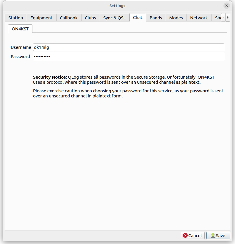 Security Notice: QLog follows stringent security practices and securely stores all passwords, including those used for the ON4KST chat server. However, it's important to note that the ON4KST chat server employs a communication protocol that transmits passwords in plain text over an unencrypted channel. Therefore, it is strongly advised that you select a unique password for this service and refrain from using it for any other purpose.