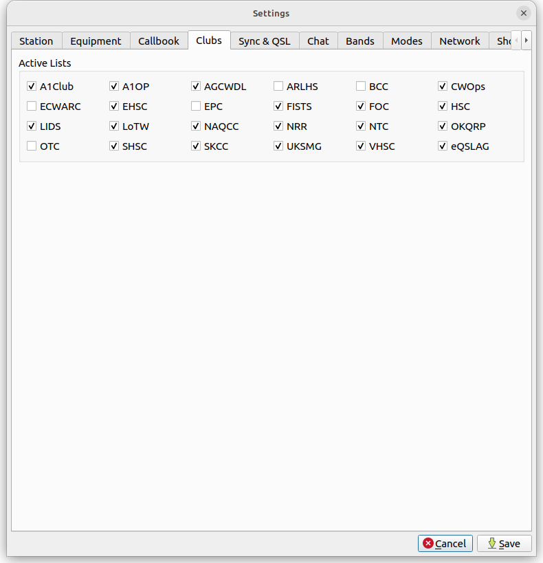 QLog can lookup a club membership. The operator can activate/deactivate clubs based on his/her interest. Enabled Club lists are regularly updated once a week if a new version of list is available. The list of available clubs is also updated on a weekly basis from Github repository. Contributions to this repository are welcome and appreciated! However, we only accept pull requests from the original sources of the membership lists. If you have membership lists that you would like to share with the ham radio community, please contact the repository maintainers to discuss your contribution.