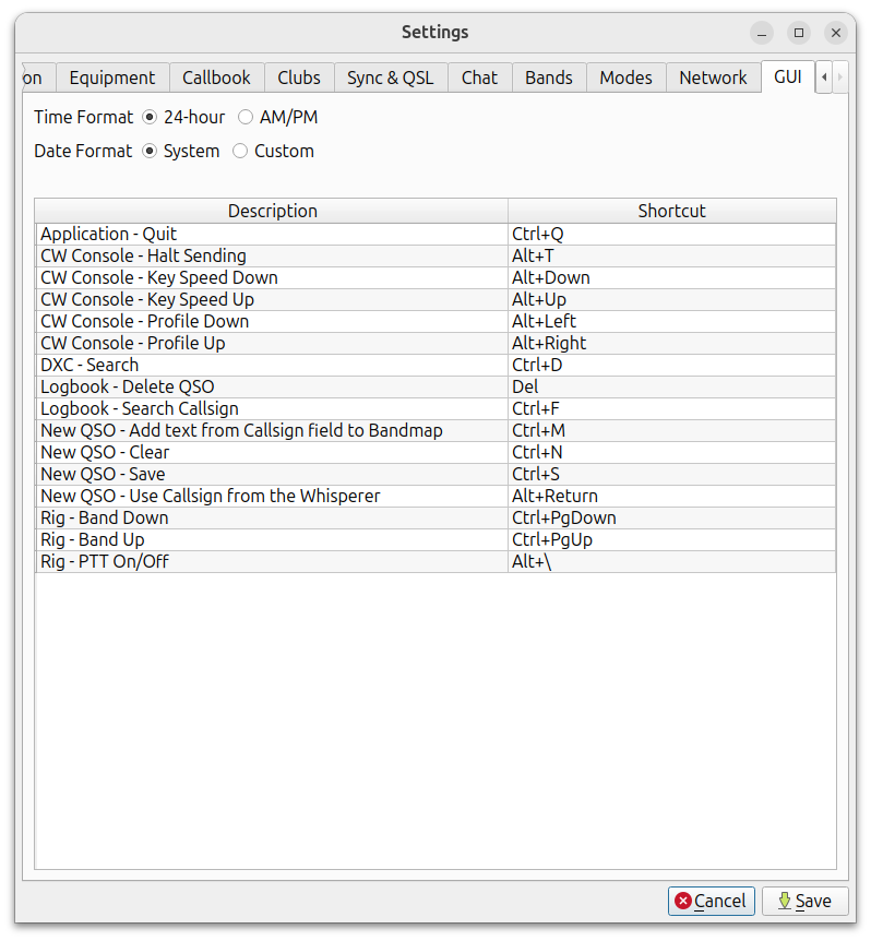 The recording of the shortcut is initiated when the Shortcut column receives focus and ends one second after the user releases the last key. QLog checks if the new shortcut is not in conflict with an already used shortcut or fixed shortcuts. If a conflict is detected, the new shortcut is not applied.