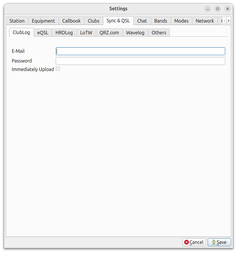 Using this tab, it is possible to set services such as LoTW, ClubLog, eQSL, QRZ.com, HRDLog, Cloudlog / Wavelog