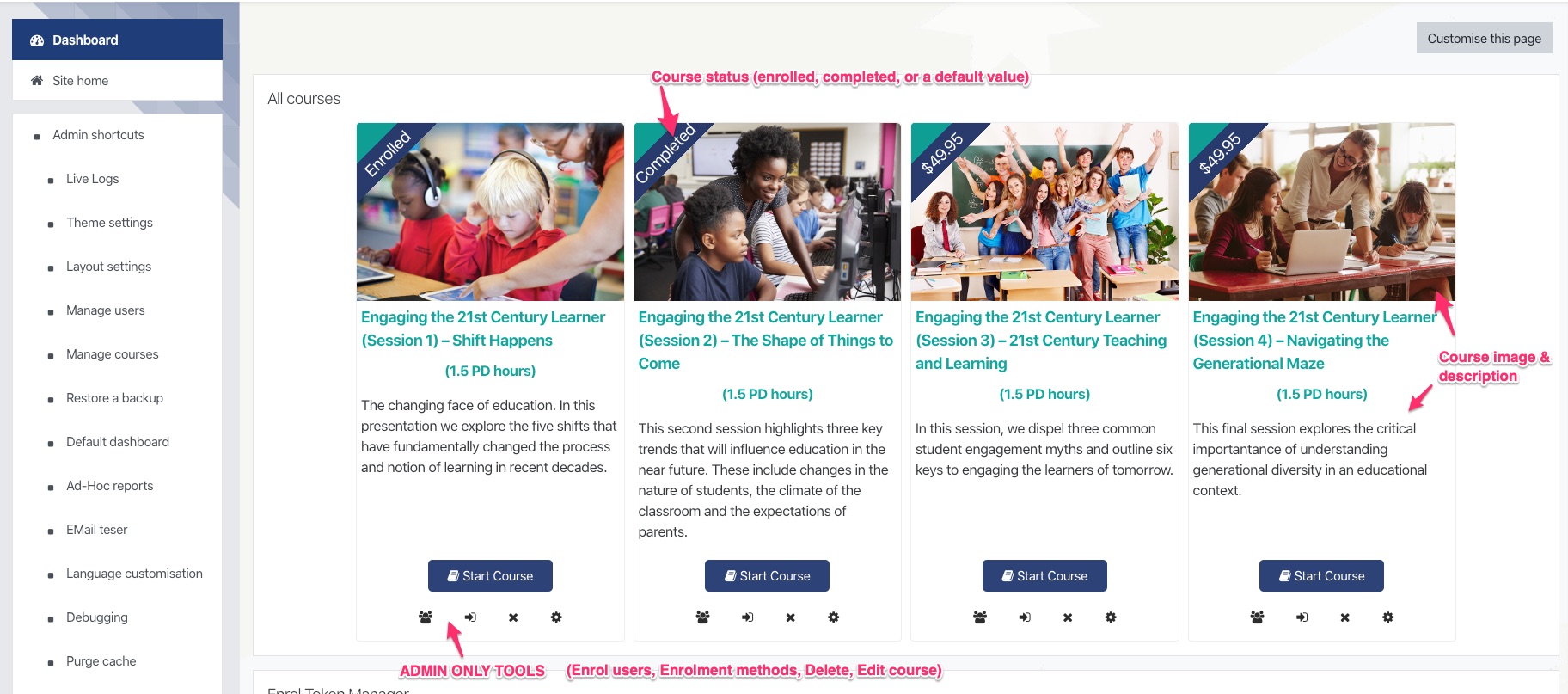 The layout uses a template which displays courses as tiles in a grid. It also writes the users completion or enrolment status onto a data attribute for each tile which you can pick up in styles, as shown below.