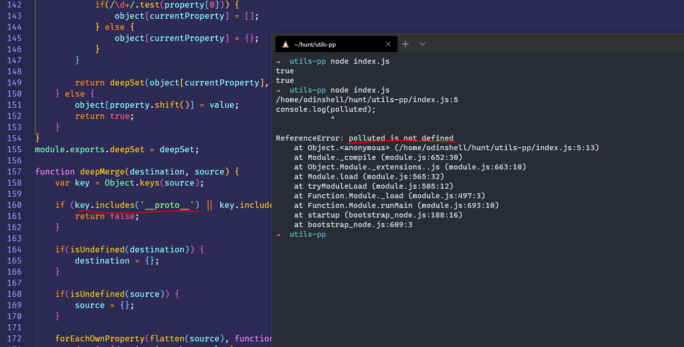 Clone the project, install the required dependencies and on running the below snippet of code, it triggers prototype pollution and logs 123.