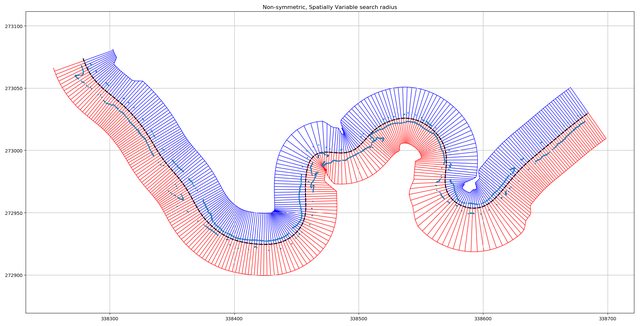 a spatially variable search radii can be added by adding extra columns to the input centerline data and used in the fuctions
